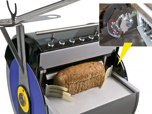 Openings- en sluitingsmechanismen voor machine afschermkappen Om verwonding aan broodsnijmachines bij zelfbediening uit te sluiten, start het automatische snijden van het brood pas, wanneer de klep van deze mo...